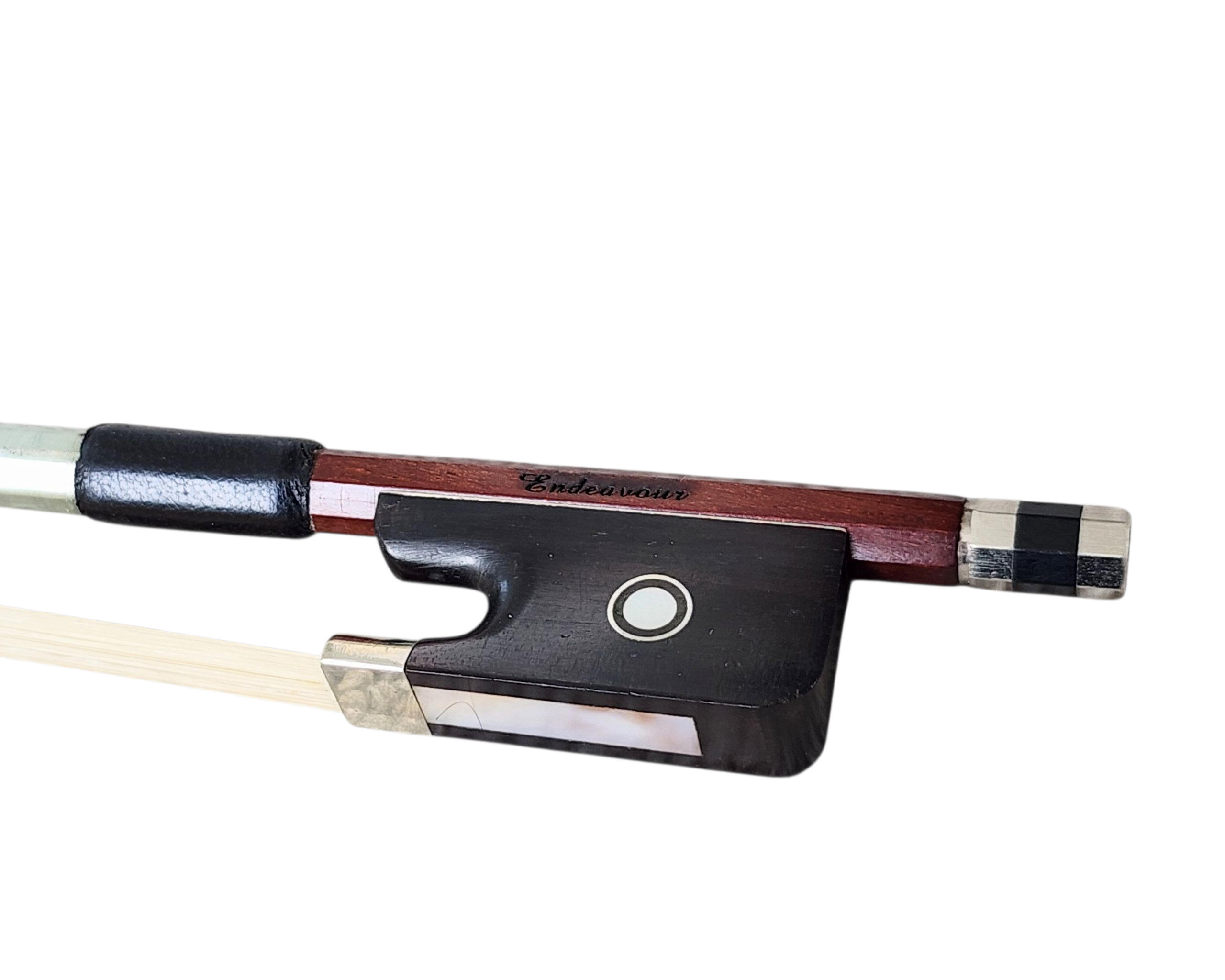 Bow: Endeavour 'Student' model bow. Brazilian hardwood stick. Nickel mounted ebony frog. Natural unbleached horsehair. Silver lapping. Leather thumb grip.